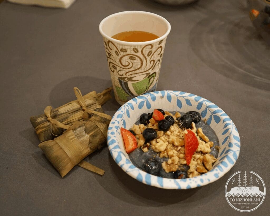 The evening started with some light Diné refreshments such as tóshchíín (blue corn mush), be’estł’óní (blue corn tamales), and ch’il ahwééh (Navajo tea) before the presentation began. Creative Flagstaff executive director Julie Comnick opened the show with a short recap of the exhibit and the artist involved, followed by TNA executive director Nicole Horseherder.