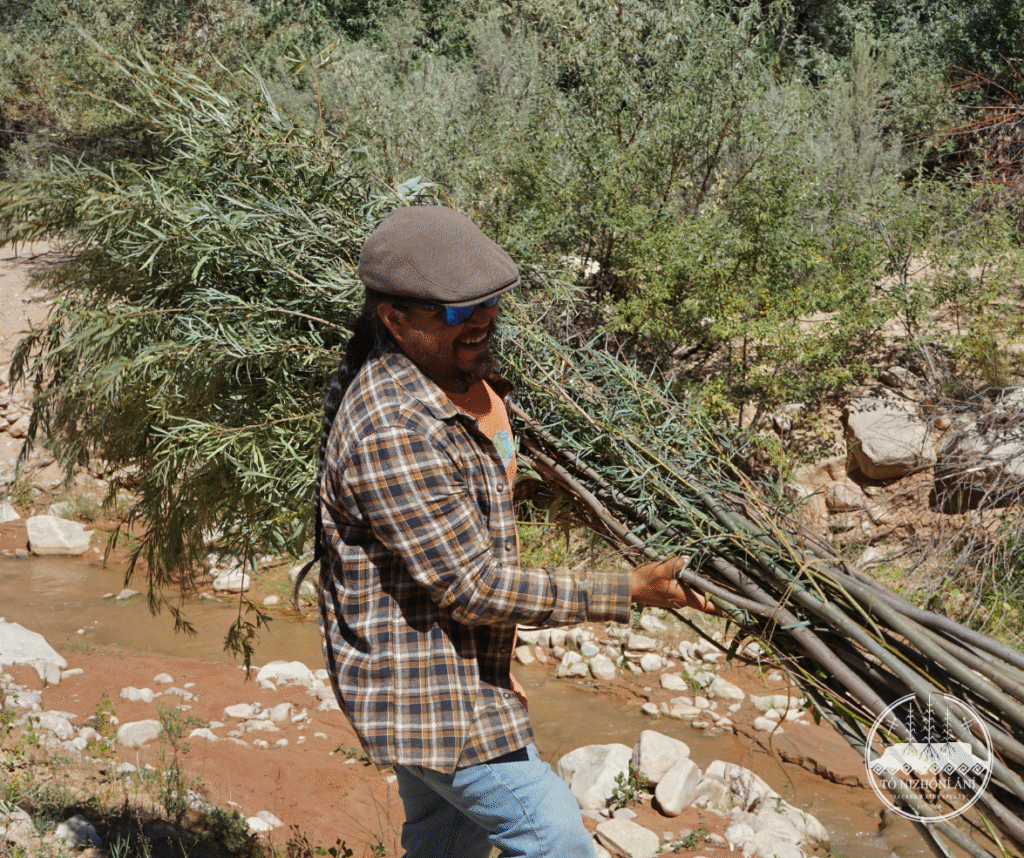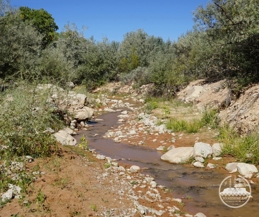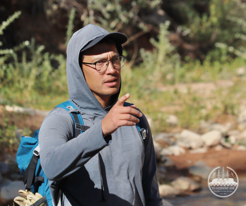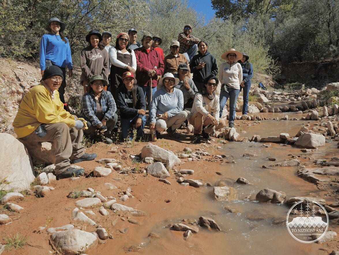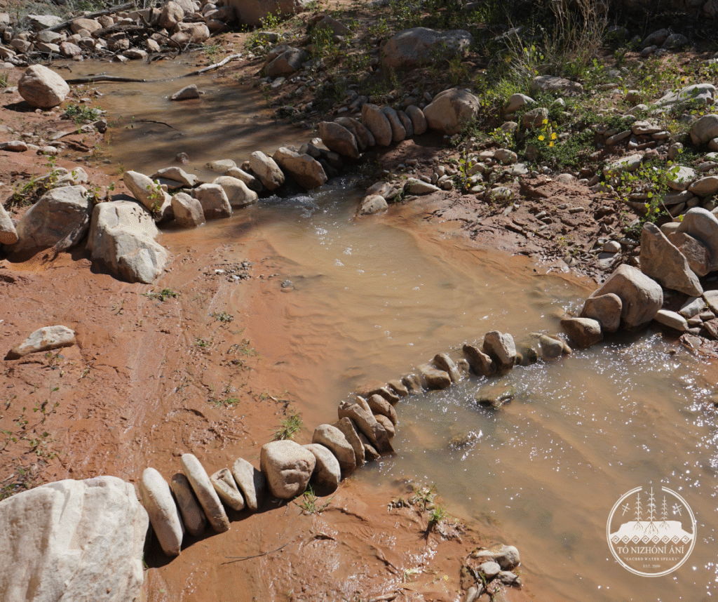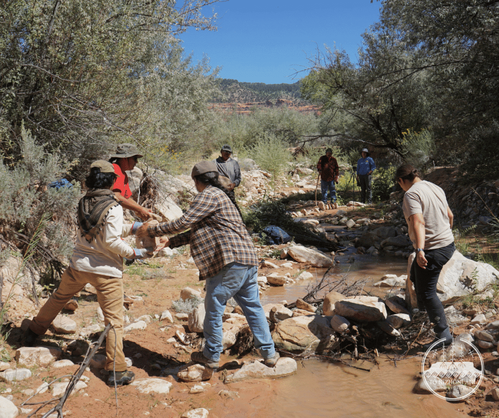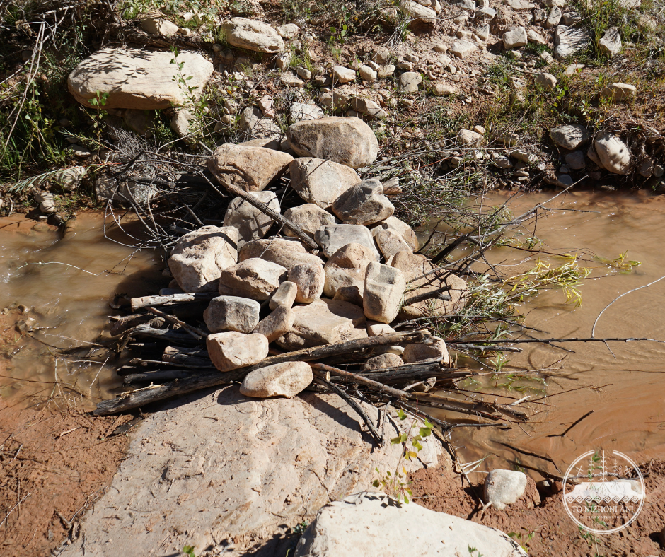 On September 24, 2025, the Tó Nizhóní Ání (TNA) watershed and food sovereignty crew members traversed across the Navajo Nation to attend a Volunteer Day organized by the Navajo Nation Department of Fish & Wildlife’s Diné Native Plants Program. The TNA field crew attended one of the three workdays at the Tó Tsoh (Big Water) Wash located within the Lukachukai (Lókʼaaʼchʼégai) community. The Diné Native Plants Program organized an installation of Beaver Dam Analogs (BDAs) with erosion control structures in the Tó Tsoh Wash. The Tó Tsoh Wash is a tributary of the Chinle Wash/Creek which feeds into the greater San Juan River on the Navajo Nation.