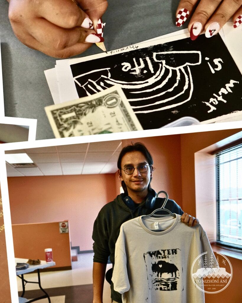 On Monday, October 6th, 2025, Tó Nizhóní Ání organized a Youth Printmaking Workshop at the Hardrock Chapter House, which began at 8 AM by setting up and receiving community to ending the event by mopping, wiping the last countertop, and giving away the last bowl of tóshchíín (blue corn mush). The Printmaking Workshop was an event organized by Tó Nizhóní Ání (TNA) in collaboration with the Sierra Club AZ, Center for Biological Diversity and Wingbeat 88. The workshop was directed to reach and educate the youth of Hardrock, AZ on environmental justice and water conservation issues in the region, and how art plays a role in organizing around water protection. Over 50 community members joined us for the day, with some folks traveling from as far as Bird Springs, AZ to attend.